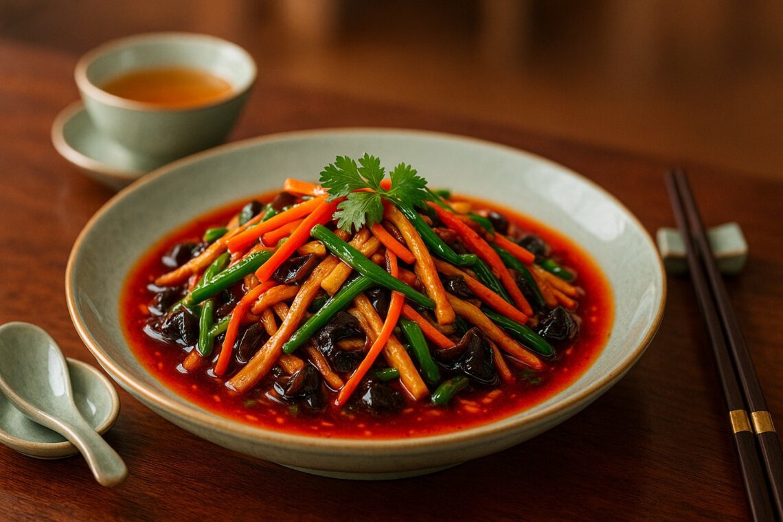 素魚香肉絲是一道以豆干絲取代傳統肉絲的川味素食料理,酸、甜、鹹、辣交織,香氣濃郁、層次豐富。豆干絲富含植物蛋白,質地緊實有嚼勁,能夠很好地吸附魚香汁,使整體口感豐富又不失清爽。搭配木耳、胡蘿蔔與青椒,可以補充膳食纖維、維生素與礦物質,使營養更加均衡。魚香味型的核心在於豆瓣醬的發酵香氣與醋、糖的協調比例,不含魚卻能呈現獨特的「魚香」風味。此素食版本不僅保留了川菜的鮮活與香濃,也因無肉而更加輕盈不膩,適合素食者與低脂飲食者。無論拌飯或拌麵都十分下飯,是一一道簡單快手又營養美味的素食家常菜。