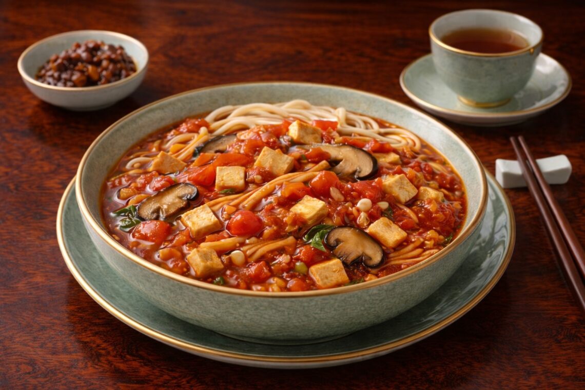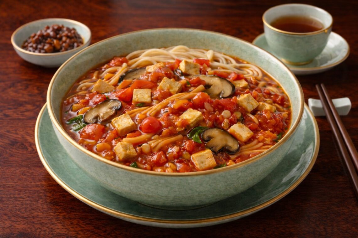 Weekly Buddhist Diet: Tomato Thick Sauce Noodles Fourth week of December 2025 Summary: Tomato Thick Sauce Noodles is a bright, comforting vegetarian noodle dish featuring a rich, naturally sweet and tangy tomato-based sauce. Fresh tomatoes are cooked down until soft and saucy, developing deep flavor without the need for animal ingredients. Tofu cubes, enoki mushrooms, and shiitake mushrooms add protein, texture, and nutritional depth. The sauce is lightly seasoned and thickened to achieve a smooth consistency that coats the noodles beautifully. Tomatoes are rich in lycopene, antioxidants, and vitamin C, which support immunity and digestive health. This dish is satisfying yet light, making it ideal for lunch or dinner. It…