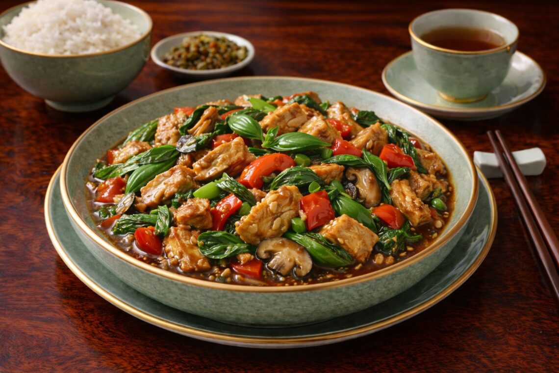 Weekly Buddhist Diet: Thai Basil Vegan Duck Third week of December 2025 Summary: Thai Basil Vegan Duck is a vibrant and aromatic plant-based stir-fry inspired by authentic Thai cuisine. Made with chewy, protein-rich vegan duck slices and fresh Thai Holy Basil, the dish delivers a perfect balance of herbal fragrance, gentle heat, and savory depth. The high heat of stir-frying allows the vegan duck to absorb the sauce quickly, while colorful bell peppers and mushrooms add texture, nutrients, and visual appeal. The flavor foundation comes from soy sauce, vegan oyster sauce, a touch of sugar, and chili—creating a savory, slightly sweet, and refreshing taste profile typical of Thai street-style cooking.…
