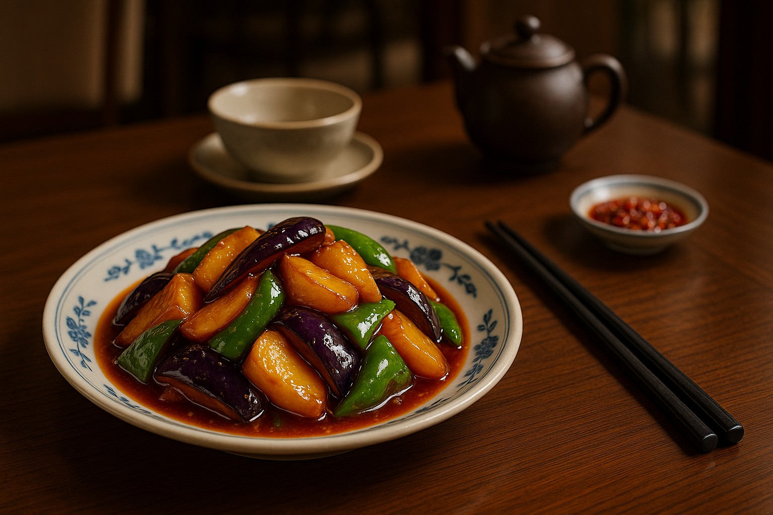 地三鲜是一道经典的东北素食家常菜,由茄子、土豆、青椒三种“来自土地”的食材组成,故得其名。“三鲜”并非靠浓重的调料堆砌,而是食材本身经煎炸炒制后的自然香气,彼此融合、相得益彰。土豆富含复合碳水与膳食纤维,能提供持久能量并帮助消化;茄子含有丰富的花青素与膳食纤维,对血管健康和抗氧化有益;青椒则带来清香微辣,并富含维生素C与植物抗氧化物。此菜采用先炸后炒的传统做法,保持土豆与茄子的外酥内嫩口感,并通过生抽与素蚝油调味,使菜品酱香浓郁而不腻。整体口感层次分明,香软中带脆、酱香中透清爽,既保留了东北风味的豪爽,又适合现代健康素食需求,是一道令人百吃不厌的经典热菜。