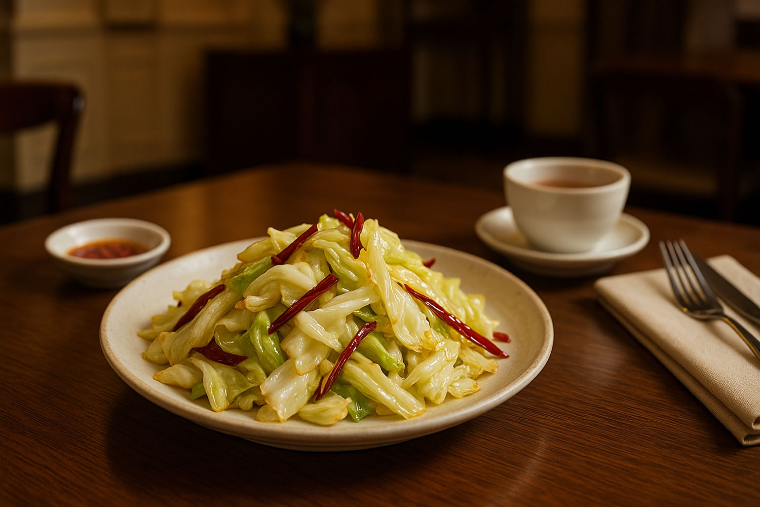 Dry-Fried Cabbage is a crisp, fragrant Chinese stir-fry dish made by quickly searing cabbage over high heat with dried chilies and a touch of soy sauce. Though simple in preparation, it delivers a delightful combination of crunch, mild heat, and natural sweetness. Cabbage is rich in vitamin C, fiber, and antioxidants, which help support immunity and digestive health. Its firm texture makes it ideal for dry-frying, as it retains crispness without releasing excess moisture. The dried chili peppers enhance aroma and add gentle warmth without overpowering the dish — perfect for those who prefer light heat. The final dish is vibrant green, lightly charred at the edges, and full of balanced flavors. It’s great served with rice or on its own as a light, plant-based entrée. Quick, healthy, and satisfying — this is a vegetarian staple worth mastering.