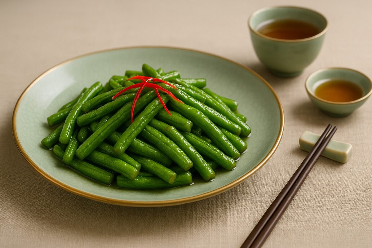 Dry-Fried String Beans is a classic Chinese vegetarian dish known for its rich aroma, crisp texture, and savory taste. Fresh green beans are blanched and then dry-fried until slightly wrinkled, bringing out their natural sweetness and fragrance. Stir-fried with dried chili and seasonings, the dish becomes flavorful yet light, with just the right amount of heat. Green beans are rich in plant protein, vitamin C, and dietary fiber, which aid digestion and strengthen the immune system. The dry-frying method minimizes oil absorption while keeping the beans tender and aromatic. Optionally, you can add minced mushrooms or vegetarian meat crumbles for extra texture and depth. Perfect as a main or side dish, this wholesome recipe captures the essence of Sichuan-style vegetarian cuisine — simple, bold, and irresistibly delicious.