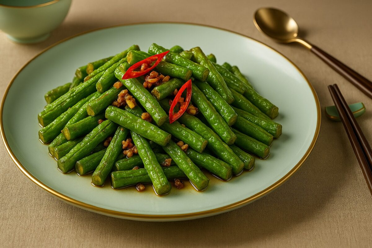 乾煸四季豆是一道色香味俱全的經典中式素食菜餚,口感鮮香、外酥內嫩、鹹香下飯。選用嫩綠四季豆,經過汆水與乾煸兩道工序,使豆莢表皮微皺、香氣濃郁。搭配素食調料與乾辣椒炒製,香味撲鼻,油而不膩。四季豆富含植物蛋白、維生素C與膳食纖維,能夠促進腸道蠕動、增強免疫力;乾煸的烹飪方式減少了油脂吸收,既保留了豆香,又保留了清爽口感。本菜適合搭配米飯或麵食,是家庭素食餐桌上的常見佳品。若想更添風味,可加入素肉末或香菇丁,使層次更豐富。乾煸四季豆以簡單的做法展現了植物食材的自然香氣與層次,是素食者最喜愛的川味家常菜之一。