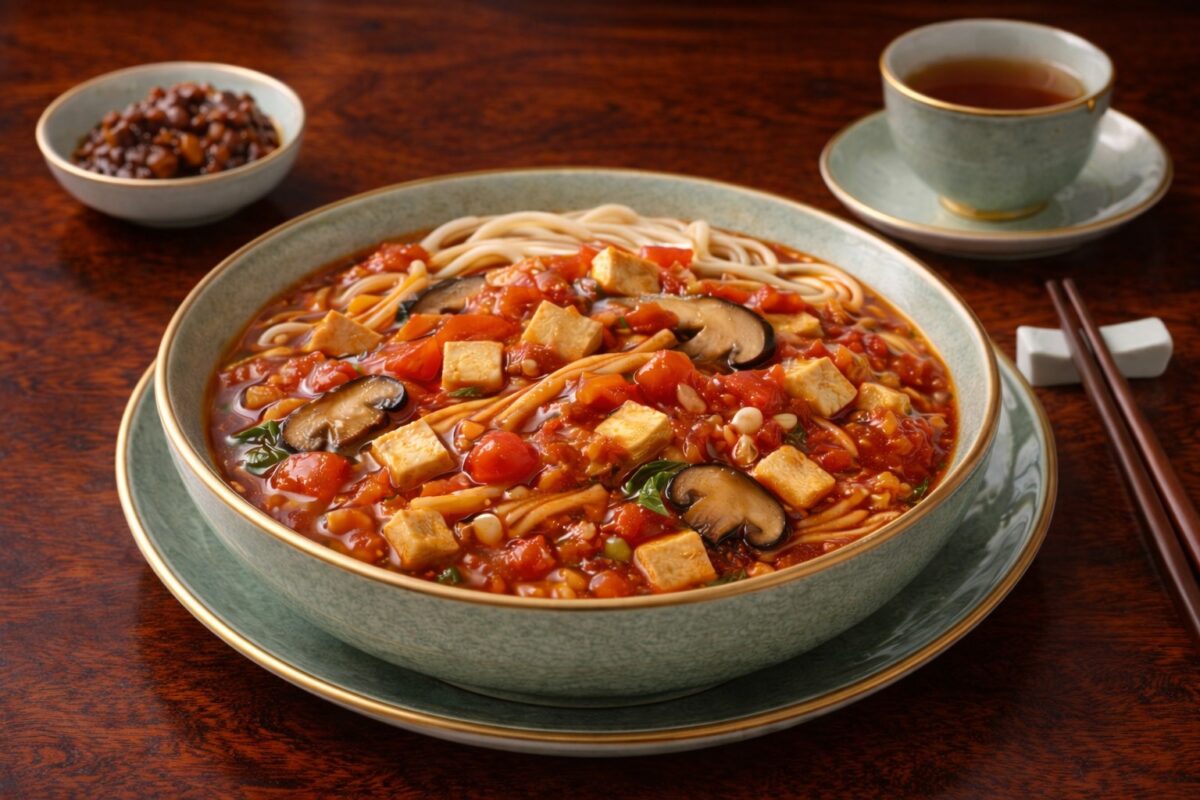 Tomato Thick Sauce Noodles is a bright, comforting vegetarian noodle dish featuring a rich, naturally sweet and tangy tomato-based sauce. Fresh tomatoes are cooked down until soft and saucy, developing deep flavor without the need for animal ingredients. Tofu cubes, enoki mushrooms, and shiitake mushrooms add protein, texture, and nutritional depth. The sauce is lightly seasoned and thickened to achieve a smooth consistency that coats the noodles beautifully.