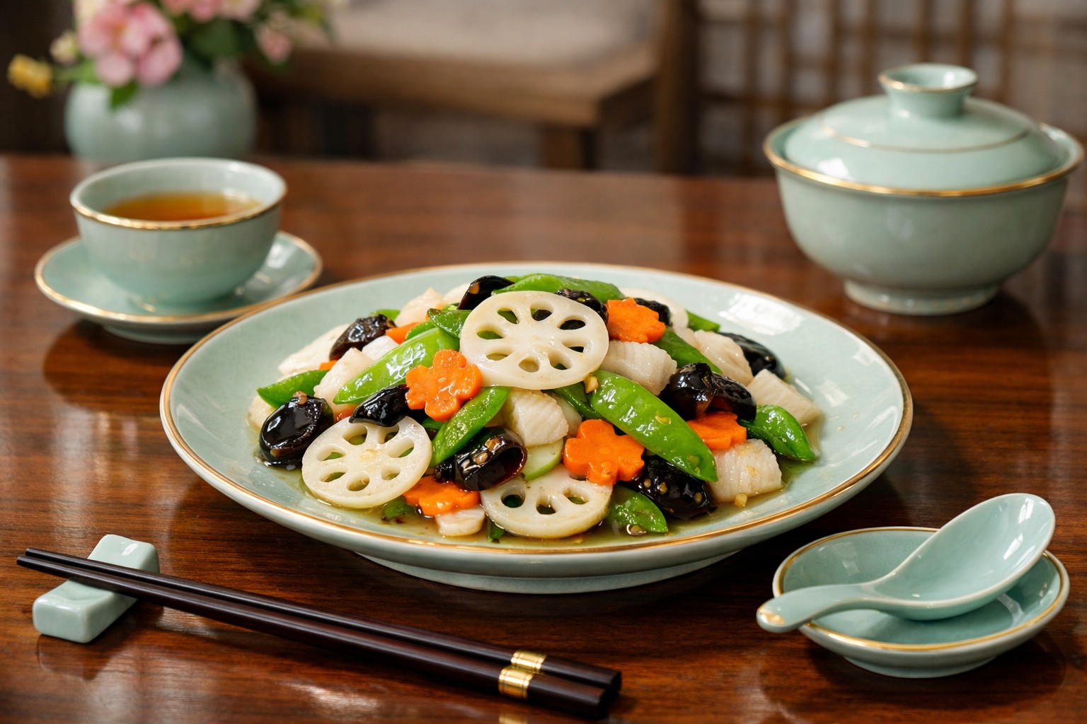荷塘小炒是一道色彩清雅、層次分明的經典素食清炒菜,以蓮藕的清脆爽口為核心,搭配胡蘿蔔、荷蘭豆、黑木耳等多種蔬菜,呈現出宛如荷塘般清新自然的視覺與口感體驗。蓮藕切片後在快火中翻炒,仍保留脆嫩多汁的質地;胡蘿蔔增添自然甜味與鮮艷色澤;黑木耳則帶來柔韌彈性,使整道菜口感豐富卻不厚重。整體調味清淡,以食材本味為主,吃起來清香爽口、回味自然。