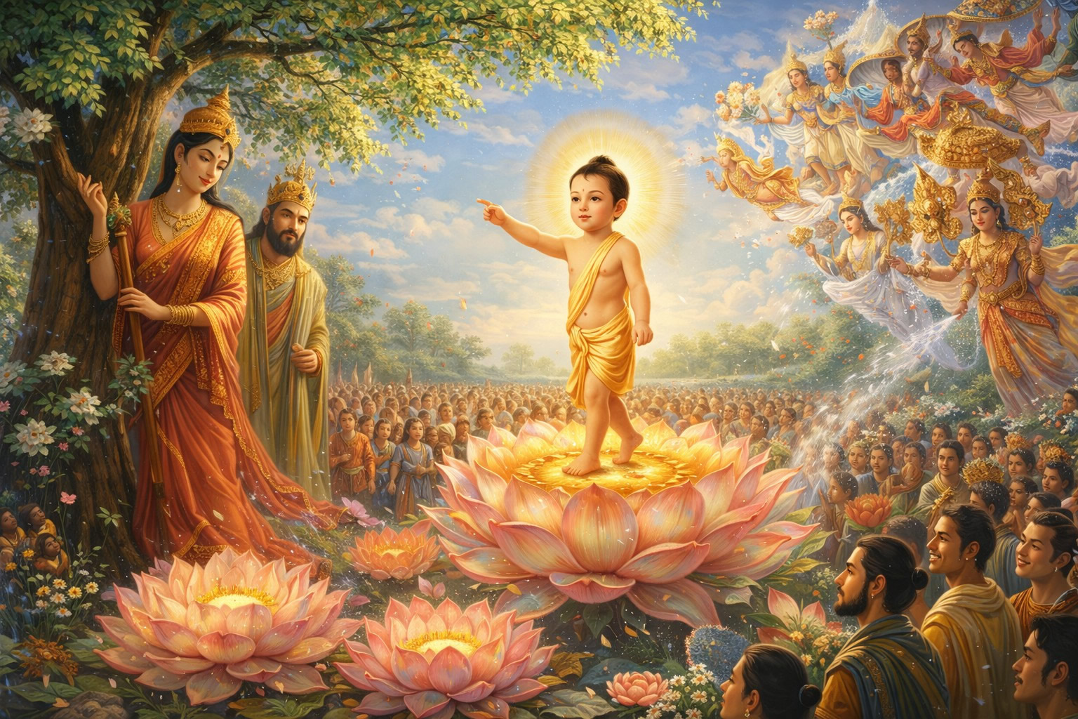 相傳此刻,日光倍加明朗,萬花爭妍綻放,百鳥齊鳴歡歌,天地之間洋溢著祥和與喜悅,皆為慶賀太子降臨人間。