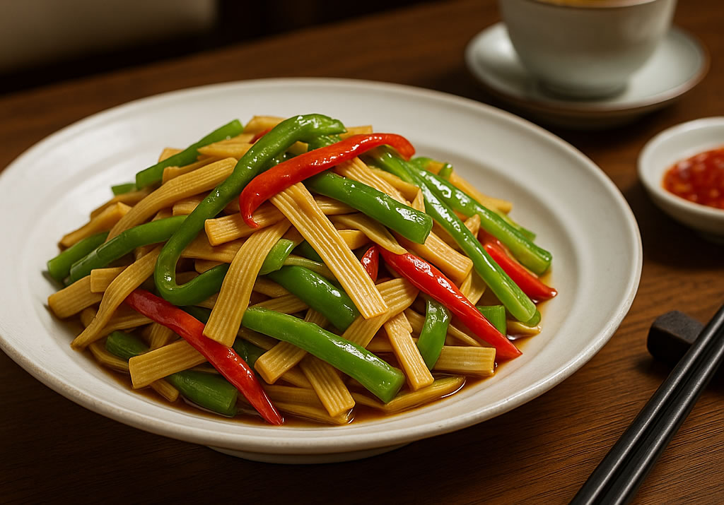 Weekly Buddhist Diet: Stir-Fried Tofu Skin with Green and Red Peppers Summary: This stir-fried tofu skin dish with green and red peppers is a nutritious and vibrant plant-based entrée. Tofu skin (also called bean curd sheets) is a high-protein, low-fat food made from soybeans — ideal for vegetarians looking for a quality protein source without cholesterol. Green peppers provide crunch and are rich in vitamin C and antioxidants, while red peppers offer a hint of sweetness and balance. The tofu skin is blanched briefly to remove any beany smell and then stir-fried to preserve its chewy texture. Light soy sauce adds umami without overpowering the dish. The final result is…
